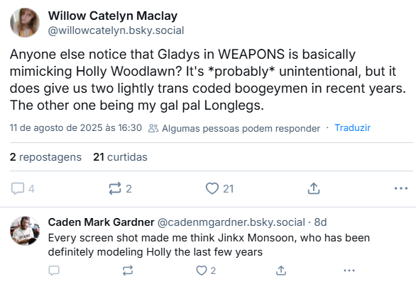 Eu tinha visto essa postagem no bluesky da crítica de cinema (e mulher trans, acho que nesse caso convém dizer) Willow Maclay, em que ela diz “Alguém percebeu que Gladys em A Hora do Mal está basicamente imitando Holly Woodlawn? *Provavelmente* não é intencional, mas isso nos dá dois bichos-papões levemente codificados como trans nos últimos anos. O outro sendo minha garota Longlegs”. Na sequência o crítico (também trans, diga-se de passagem) Caden Mark Gardner respondeu “Cada quadro me fez pensar na [drag queen] Jinkx Monsoon, que definitivamente tem incorporado Holly nos últimos anos”.