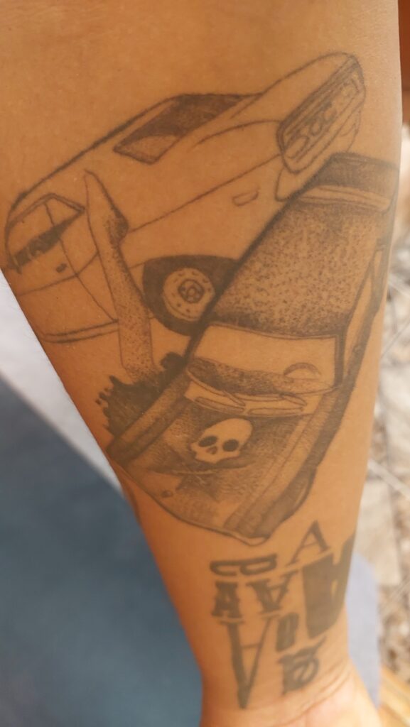 E essa data (16/06/2016) não é apenas pela mostra, mas mais ainda pelo fato de eu ter escrito um texto no catálogo, sobre um dos filmes que mais me diverte na vida que é À Prova de Morte (Death Proof, 2007). Há uns anos, até imortalizei essa conquista na minha pele, em uma tatuagem dos carros colidindo e da perninha voando (crash, boom, ploct, catapof).