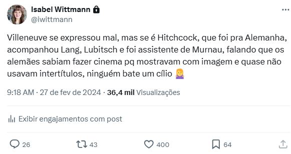 “Villeneuve se expressou mal, mas se é Hitchcock, que foi pra Alemanha, acompanhou Lang, Lubitsch e foi assistente de Murnau, falando que os alemães sabiam fazer cinema pq mostravam com imagem e quase não usavam intertítulos, ninguém bate um cílio”.