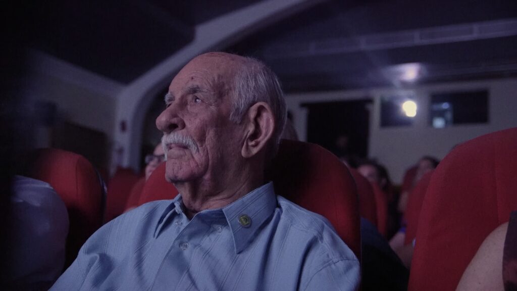 Leonardo: É interessante falar sobre isso, porque não foi exatamente planejado no sentido que eu acho que, sei lá, eu vou abordar esse tema do envelhecimento de uma maneira não repetitiva do que vem sendo abordado desse corpo idoso, a representação do corpo idoso no cinema. Eu nunca pensei sobre isso, eu confesso a você. Na verdade, isso foi feito de uma maneira intuitiva e muito relacionada com a própria personalidade do meu avô, que, com 90 e tantos anos, fazia planos para o futuro. Isso é uma coisa que eu achava linda e que me dava vontade de filmar essa forma como ele socializava com as pessoas, a forma como ele enxergava a vida, a forma como ele… Não tem nem essa coisa de não desistir, porque isso não é nem uma questão, ele tinha um vigor, realmente, uma saúde, uma vitalidade muito incrível e fascinante para mim. E aí, quando… É uma coincidência bem interessante estar lançando o Seu Cavalcanti perto do O Último Azul, porque acho que eles realmente dialogam de um jeito não óbvio e interessante. Tem até outro filme pernambucano também chamado Senhoritas (2024), de Mykaela Plotkin, que aborda esse tema também, de um jeito mais focado na sexualidade. Uma mulher mais velha e tal, não sei exatamente a idade, mas é uma idosa. E aí acho interessante que o cinema brasileiro esteja se debruçando de cada um da sua forma nessa temática e colocando um lugar que foge daquele velhinho que está sentado em uma cadeira, olhando a janela, esperando o tempo passar.