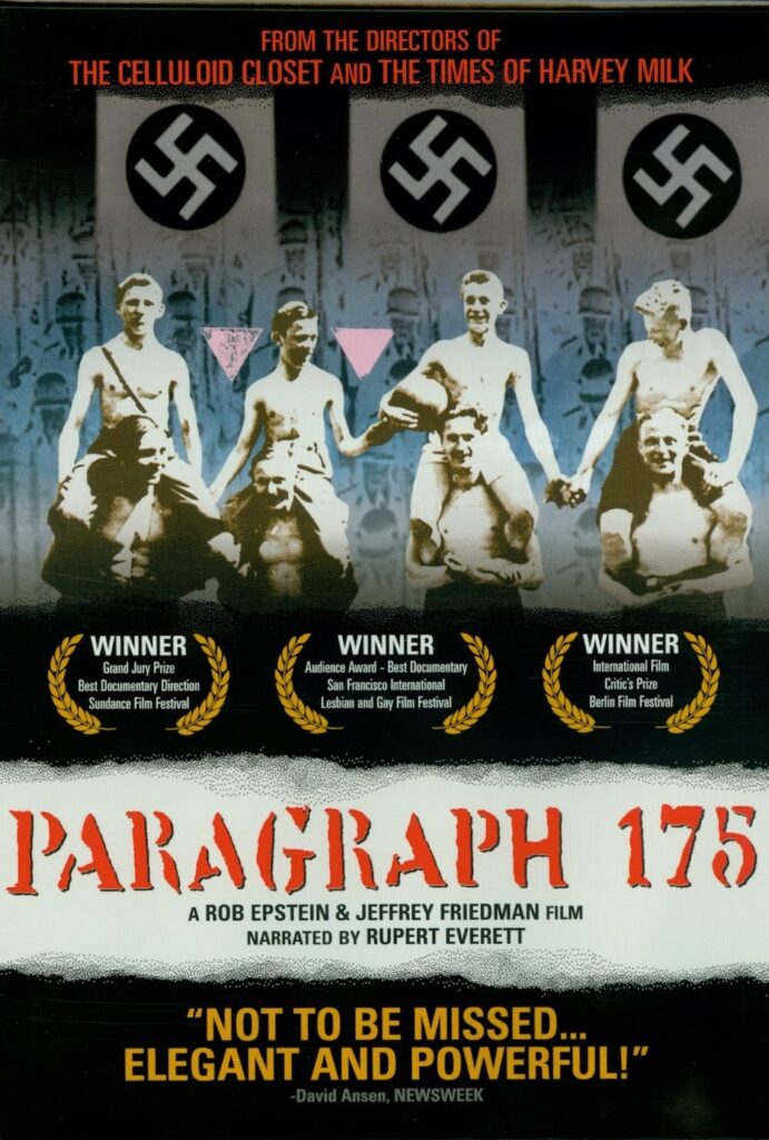 Entrando no âmbito dos documentários, a primeira indicação é Paragraph 175 (2000), dirigido por Rob Epstein e Jeffrey Friedman, que também foram responsáveis pelo clássico The Celluloid Closet (1995). Ele fala, por meio de histórias de sobreviventes, sobre as consequências da lei alemã de mesmo nome, que tornava ilegal a homossexualidade. Entre prisão, trabalho forçado e campos de concentração, onde pessoas presas recebiam um triângulo rosa em seus uniformes para marcá-las, o filme mostra o tratamento conferido a homens e mulheres que eram considerados criminosos em virtude de suas identidades.