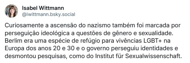 Tenho assistido com estupefação, como quase todo mundo, as tomadas de decisão de Donald Trump, novamente ocupando a cadeira da Casa Branca. Nem vou falar do horror que são os descalabros do Elon Musk. Mas uma das coisas que mais têm me afetado é ver as notícias sobre a perseguição de identidades transgênero pelo governo. Primeiro o secretário de Estado Marco Rubio proibiu a emissão de passaportes com identidade retificada para pessoas transgênero. Eu vi muita gente apavorada no bluesky, constatando que ou utiliza o nome morto e o gênero designado no nascimento, ou está virtualmente presa no país.